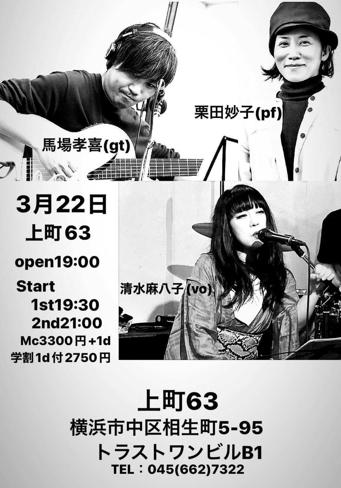 清水麻八子(vocal) 海掘弘太(piano) 古木佳佑(bass)