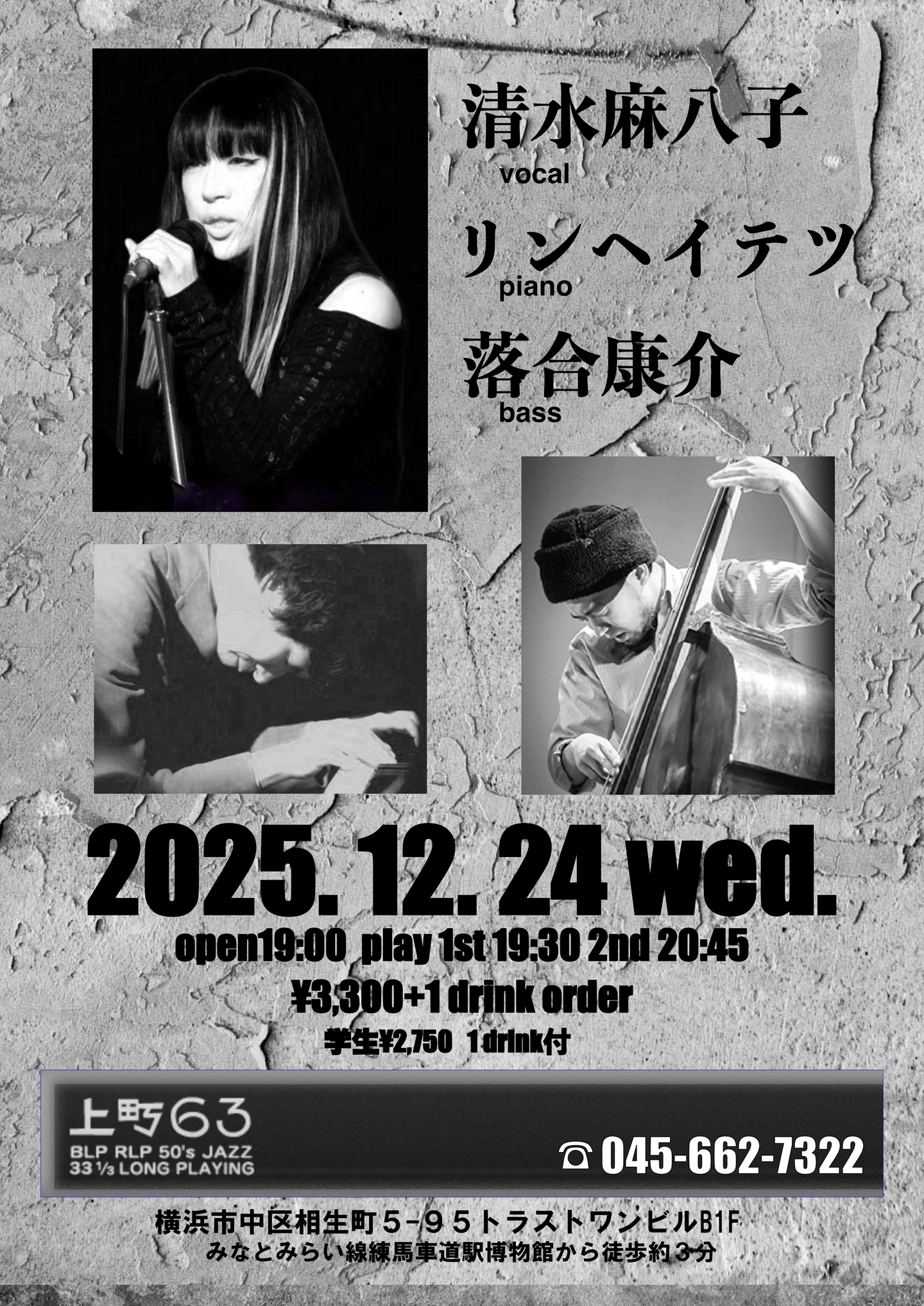 清水麻八子(vo) + リンヘイテツ(pf) + 落合康介(b)